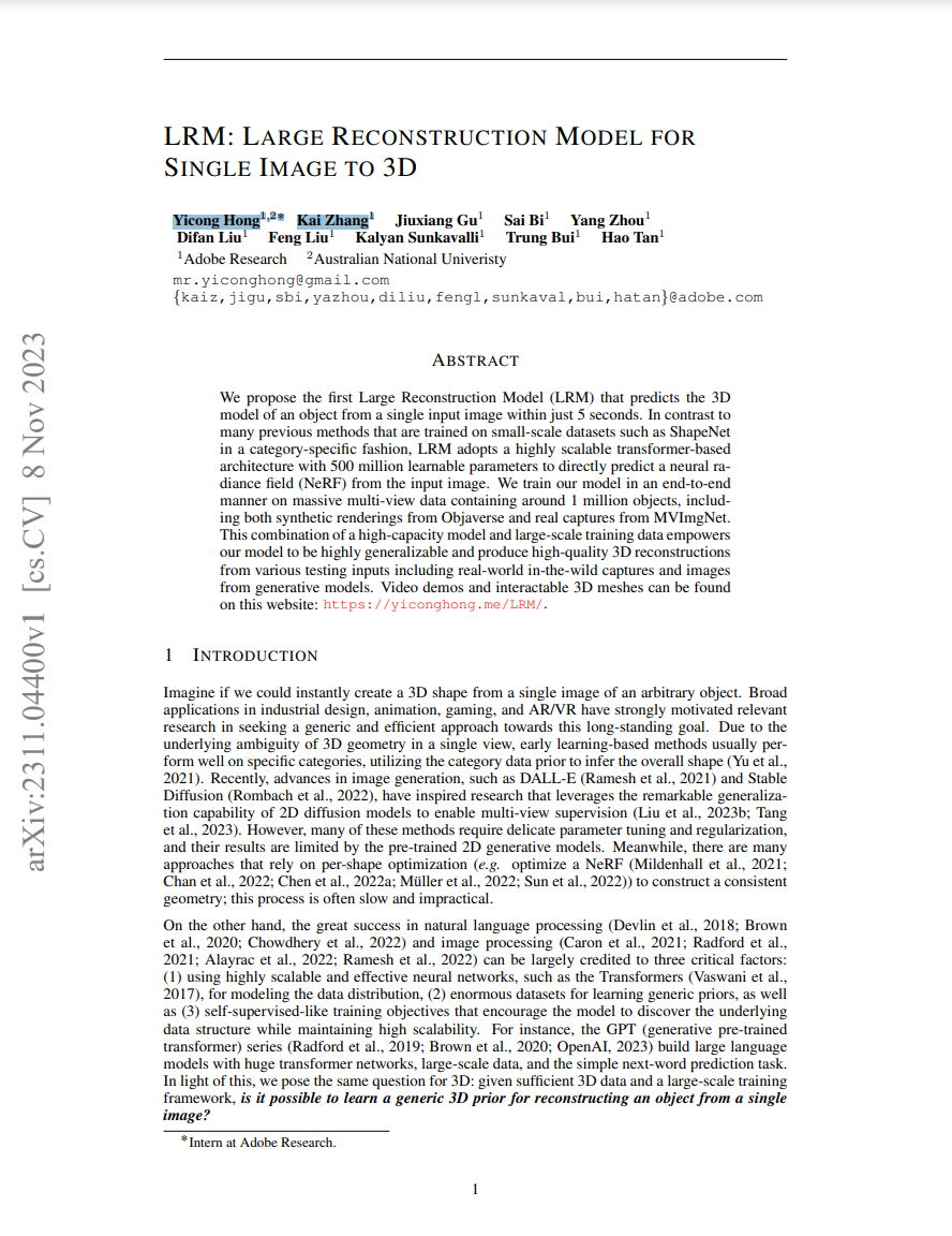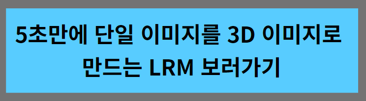 안녕하세요. 오늘은 AI 분야 최신 논문을 살펴보는 네 번째 시간입니다. 요즘 생성형 AI 기술의 발전이 매우 빠른 것 같은데요. 저번 시간에 다룬 실시간 수준 스테이블 디퓨전 이미지 생성에 이어서 이번 시간에는 5초 만에 단일 이미지를 3D 이미지로 만드는 LRM(Large Reconstruction Model, 대규모 재구성 모델)이라는 기술에 대해 알아보겠습니다.