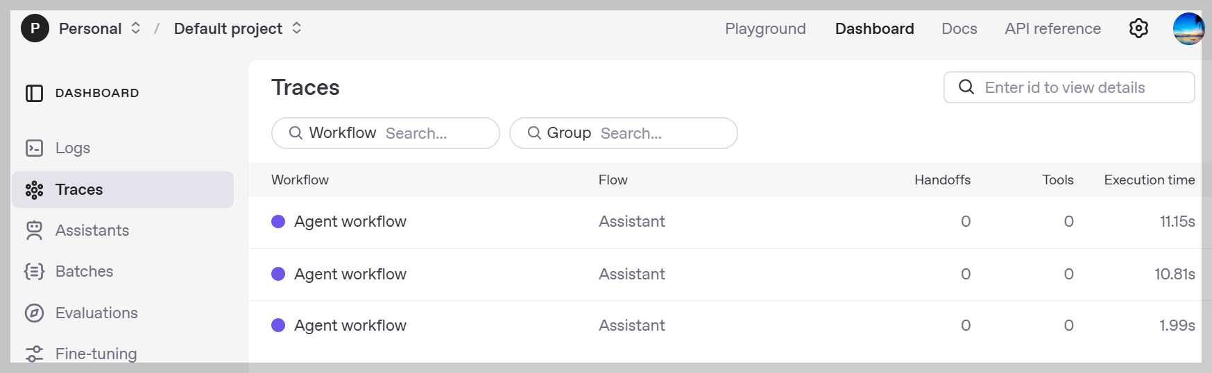 OpenAI 플랫폼에서 제공하는 Tracing 도구를 사용하여 에이전트의 동작을 모니터링하고 디버깅할 수 있습니다. Tracing 도구를 사용하면 에이전트가 수행하는 작업, 사용하는 도구, 반환하는 응답 등을 실시간으로 확인할 수 있습니다. 이를 통해 에이전트의 성능을 측정하고 개선할 영역을 식별할 수 있습니다.