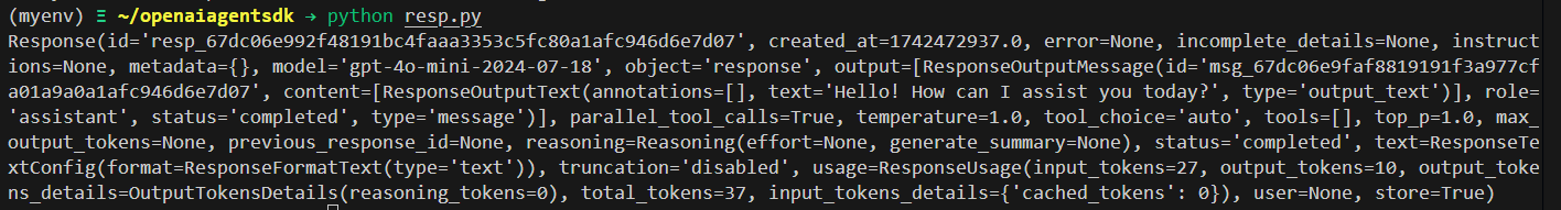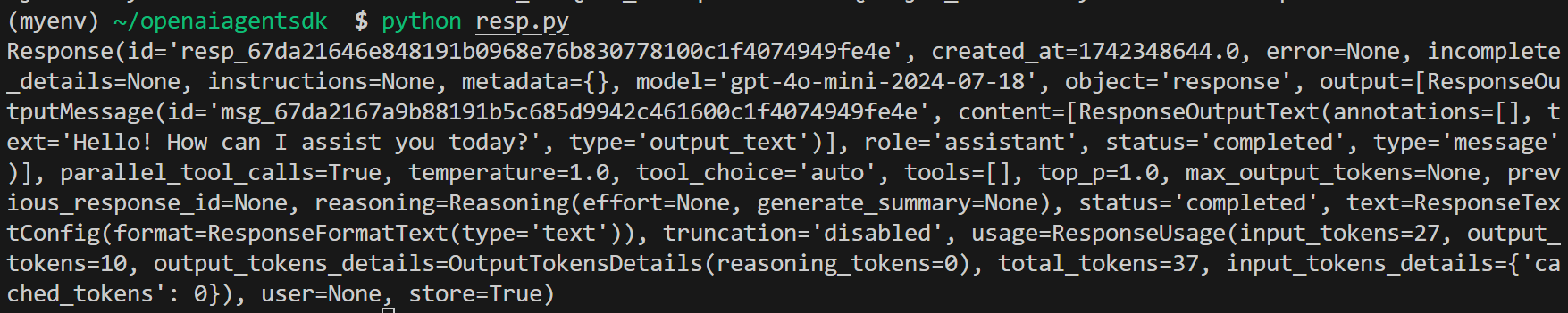from openai import OpenAI client = OpenAI() response = client.responses.create( model="gpt-4o-mini", input="Hi!" ) print(response) |
