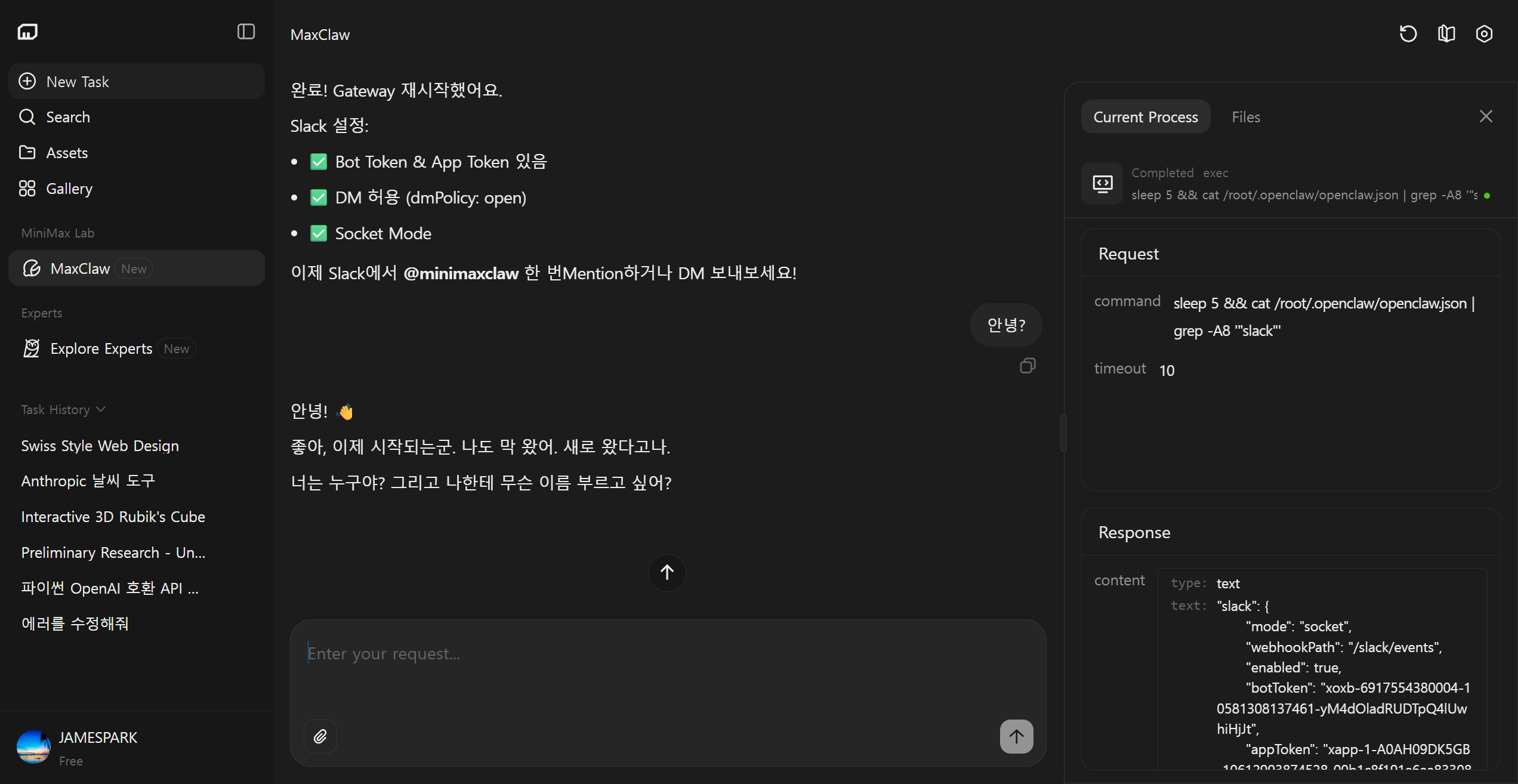 MaxClaw에게 직접 말로 "Slack 연결해줘"라고 말하면, 지침에 따라 채널 연결을 완료할 수 있습니다. 복잡한 설정 없이 대화만으로 연결됩니다!